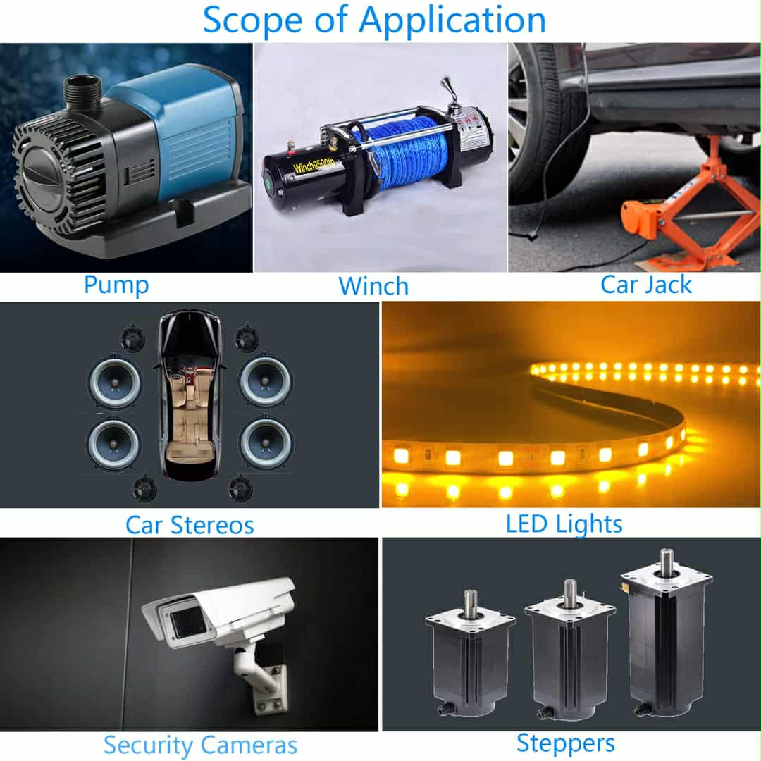 📦 Uporaba: LED trakovi in luči, avtoakustika, varnostne kamere, črpalke, vitli, dvigala, motorčki, industrijska oprema.