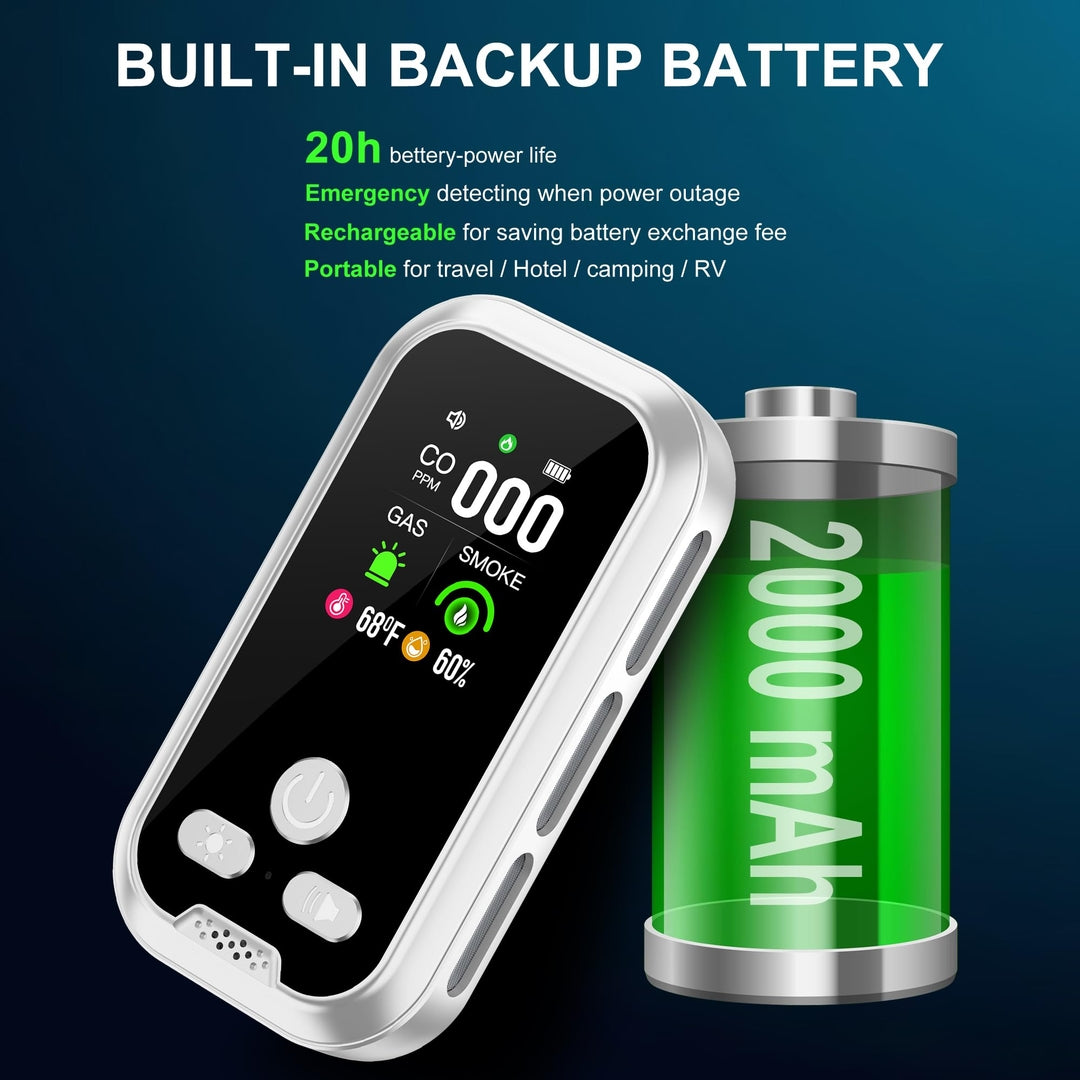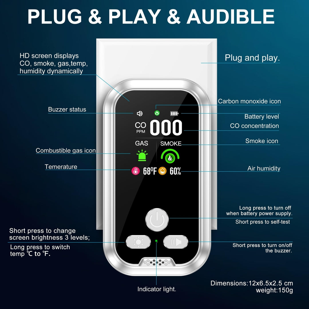🔹 Velik HD zaslon – prikaz CO ppm, dima, plina, temperature in vlage v realnem času