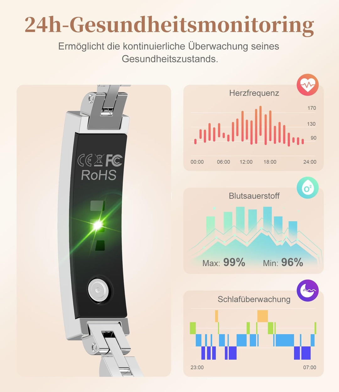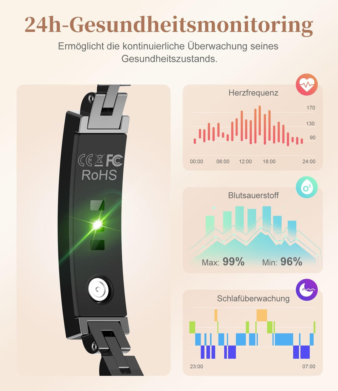 🔹 24h spremljanje zdravja – merjenje srčnega utripa, SpO₂ in nadzor spanja