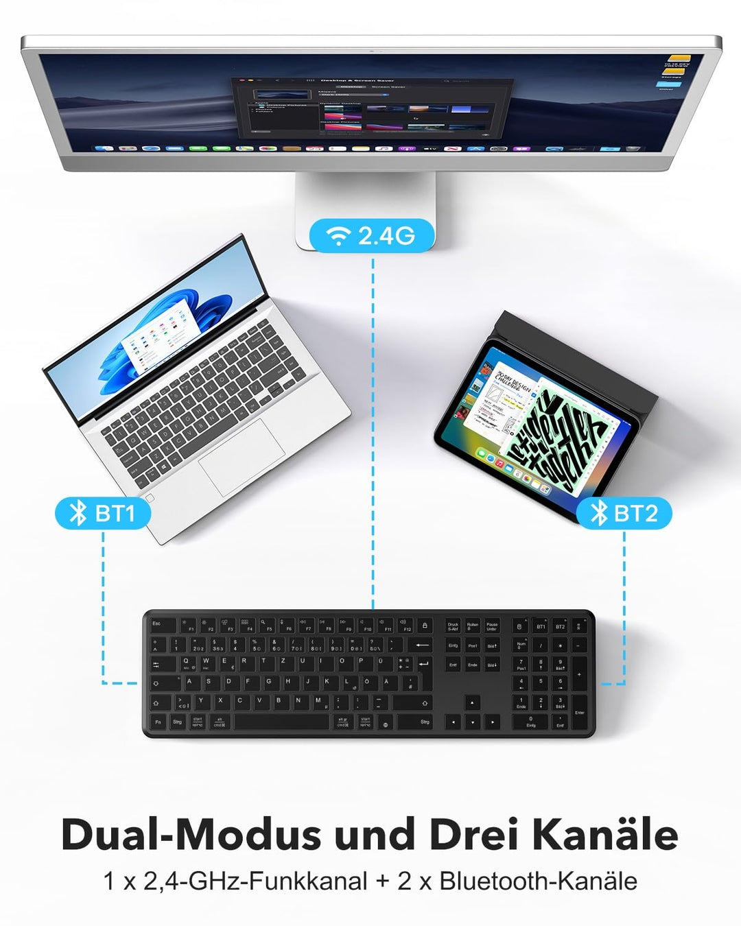 🔹 Brezžična tipkovnica z dvojnim načinom povezave (Bluetooth + 2,4 GHz USB sprejemnik)