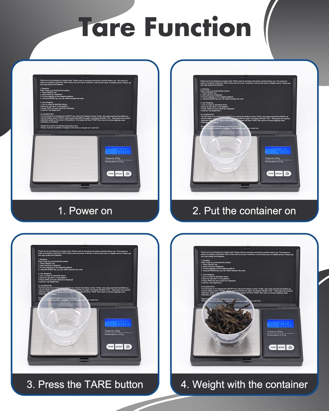 🔹 Funkcije: TARE, MODE, ON/OFF