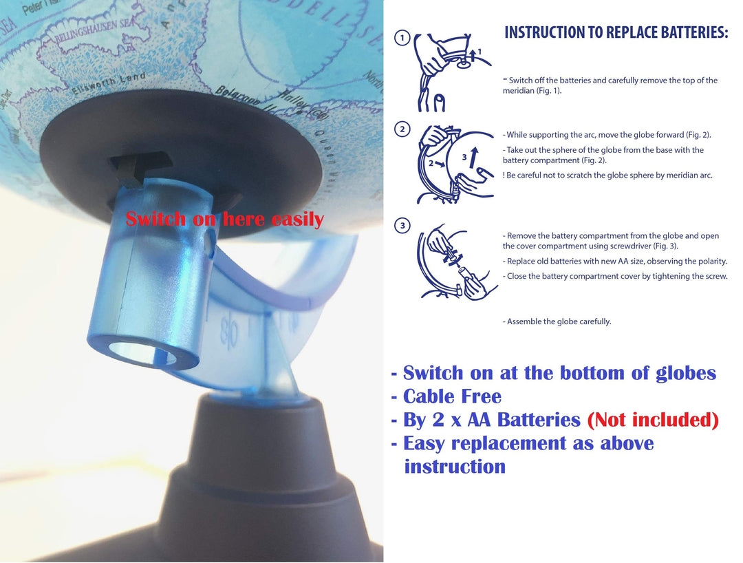 🔹 2-v-1 interaktivni globus – podnevi prikazuje realističen fizični zemljevid sveta, ponoči pa z osvetlitvijo razkrije zvezdno karto (ozvezdja)