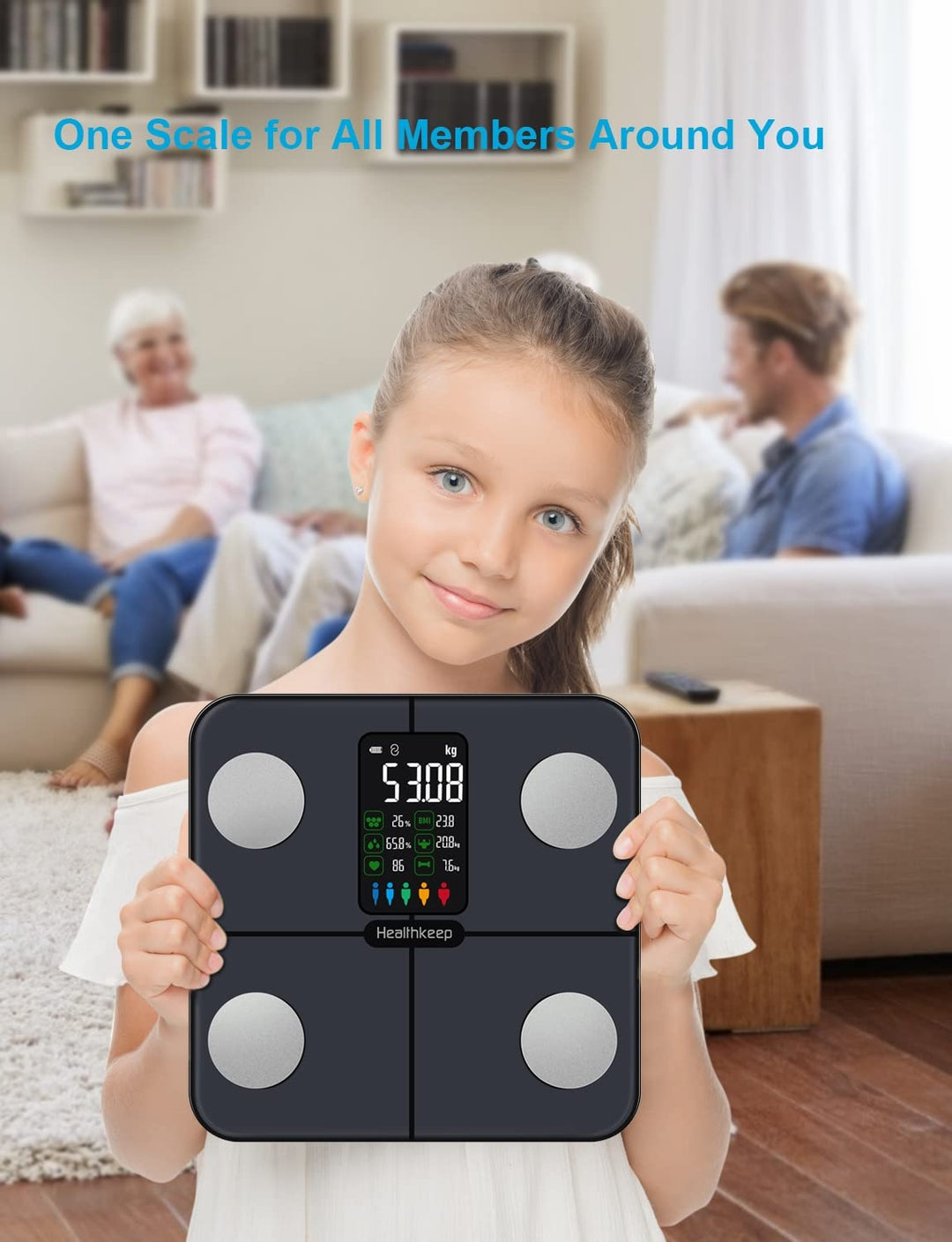 🔹 Merilne funkcije: teža, BMI, srčni utrip, telesna voda, mišična masa, maščobna masa, visceralna maščoba, kostna masa, BMR itd.