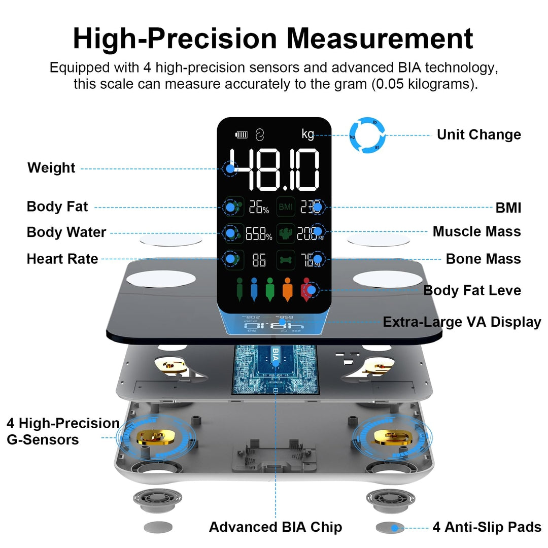 🔹 Visokonatančni G-senzorji in napredna BIA tehnologija za natančnost do 0,05 kg
