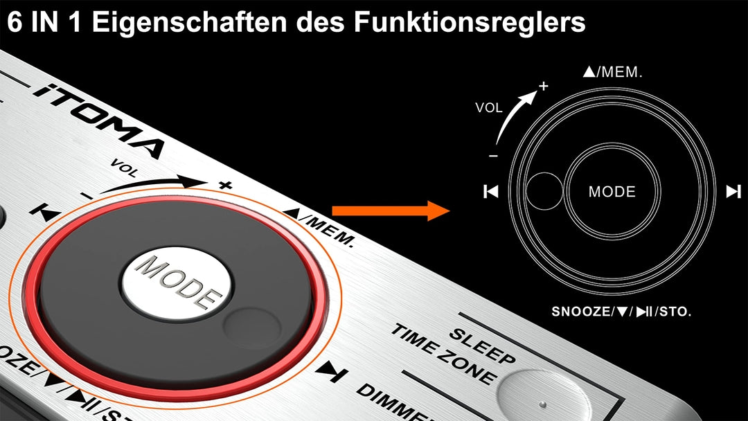 🔹 6-v-1 funkcijski gumb – upravljanje glasnosti, postaj, načina in spanja