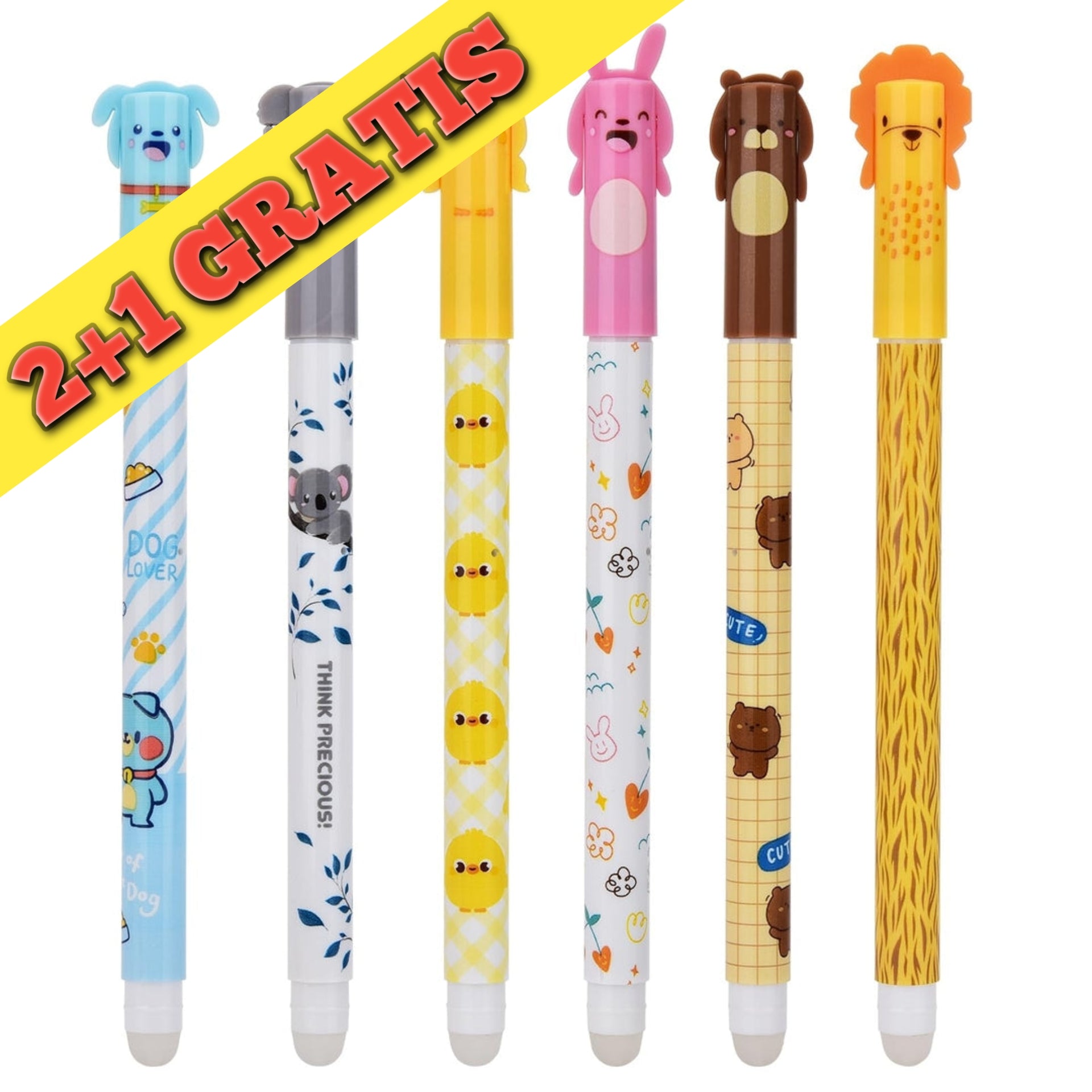 🔹 Izbrisljiva modra gel pisala z motivi živali – zajček, lev, medvedek, kuža, koala, piščanček