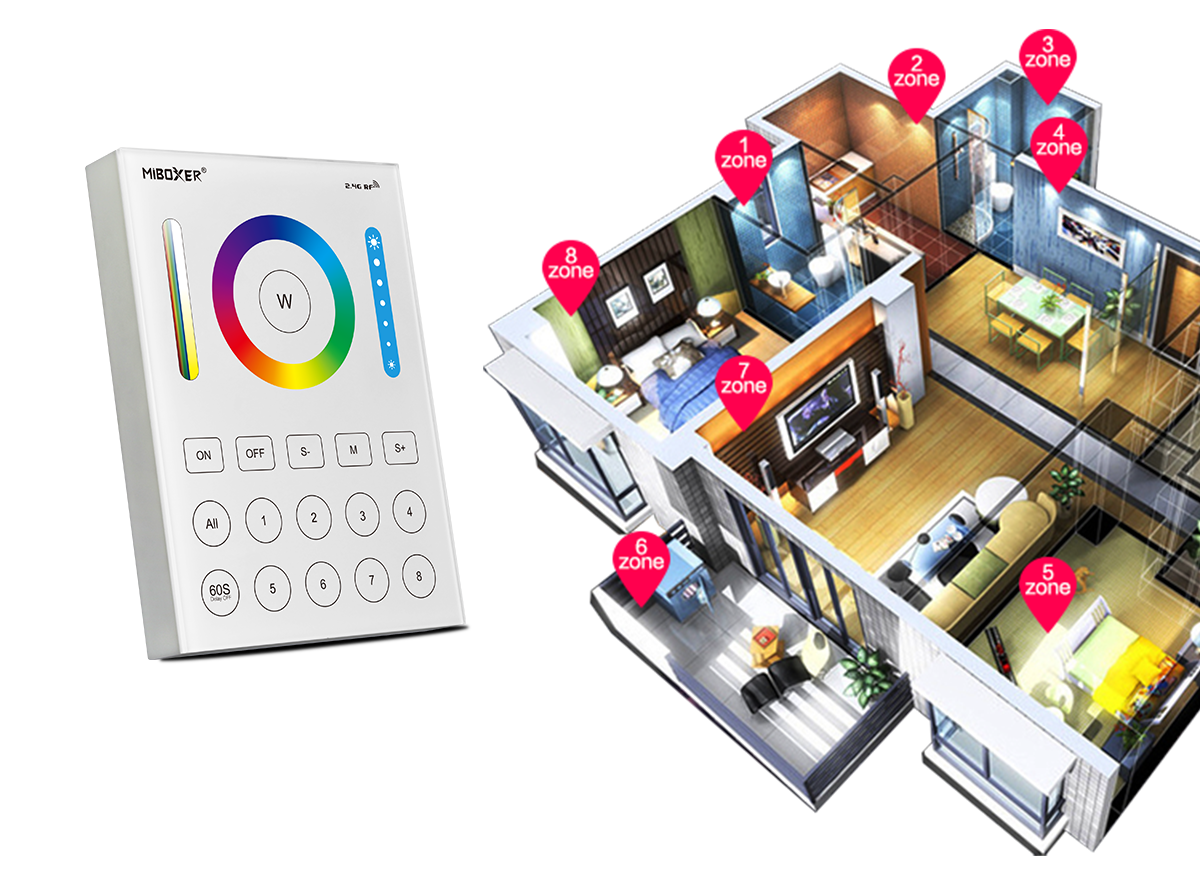 ⚙️ MiBOXER 8-Zone upravljalnik – elegantna in pametna rešitev za popoln nadzor nad razpoloženjsko svetlobo v vsakem prostoru.