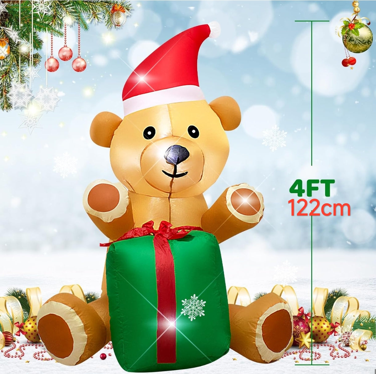 Napihljiv božični medved z darilom – tkanina Oxford, notranja LED osvetlitev, višina 122 cm