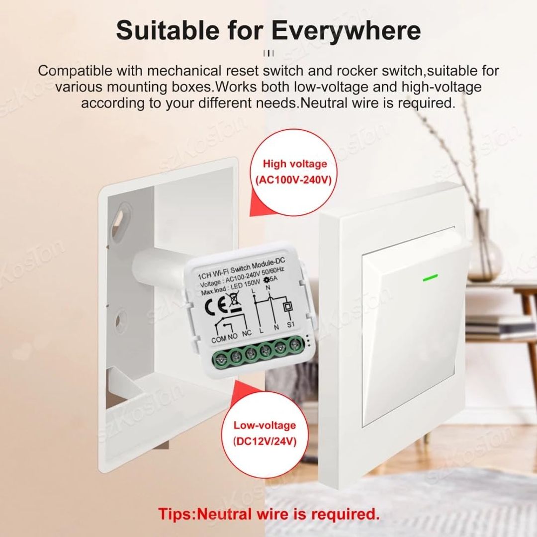 🔹 Kompaktna zasnova: Majhne dimenzije omogočajo enostavno vgradnjo neposredno v standardno podometno dozo za obstoječe stikalo.