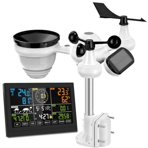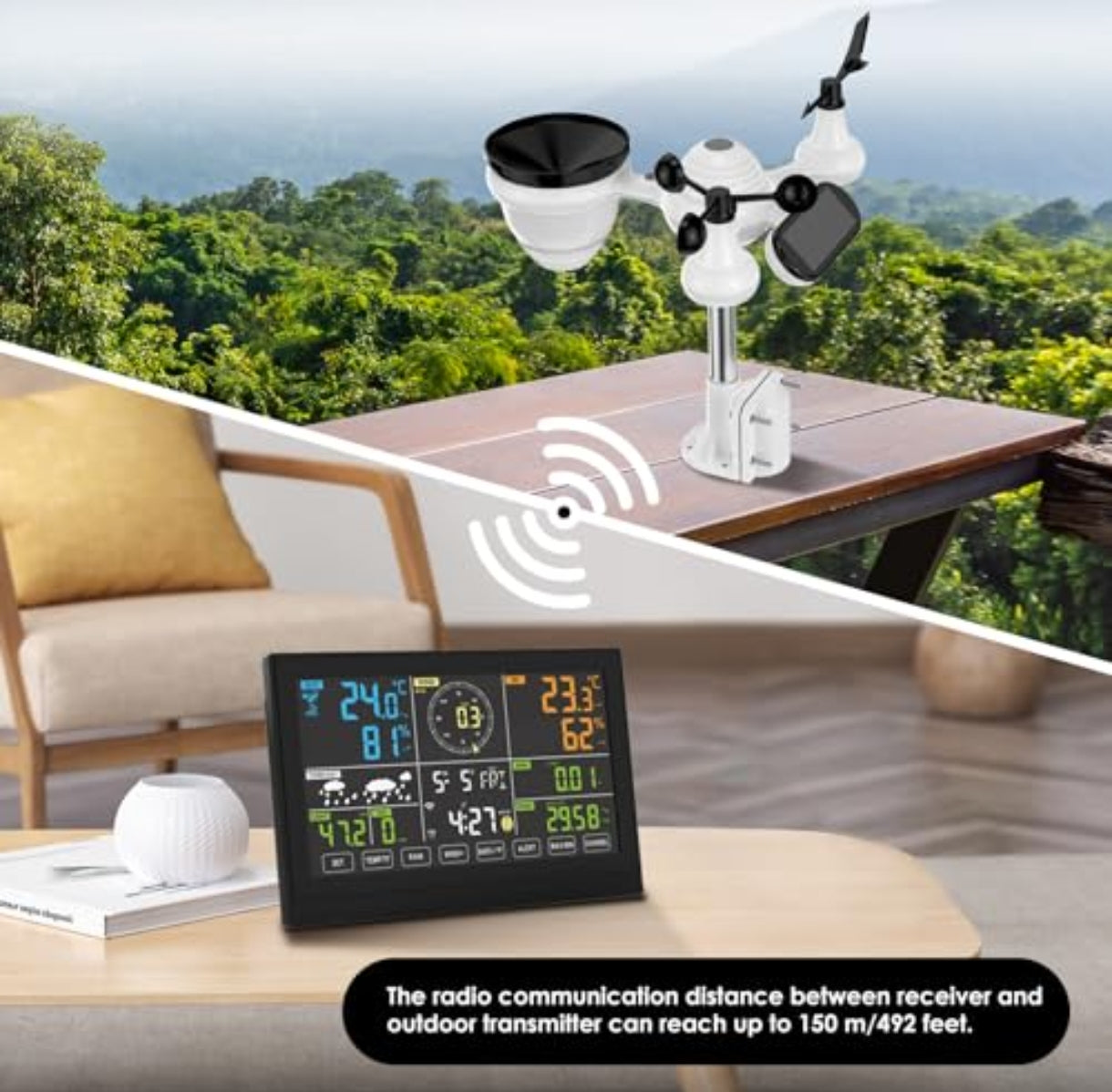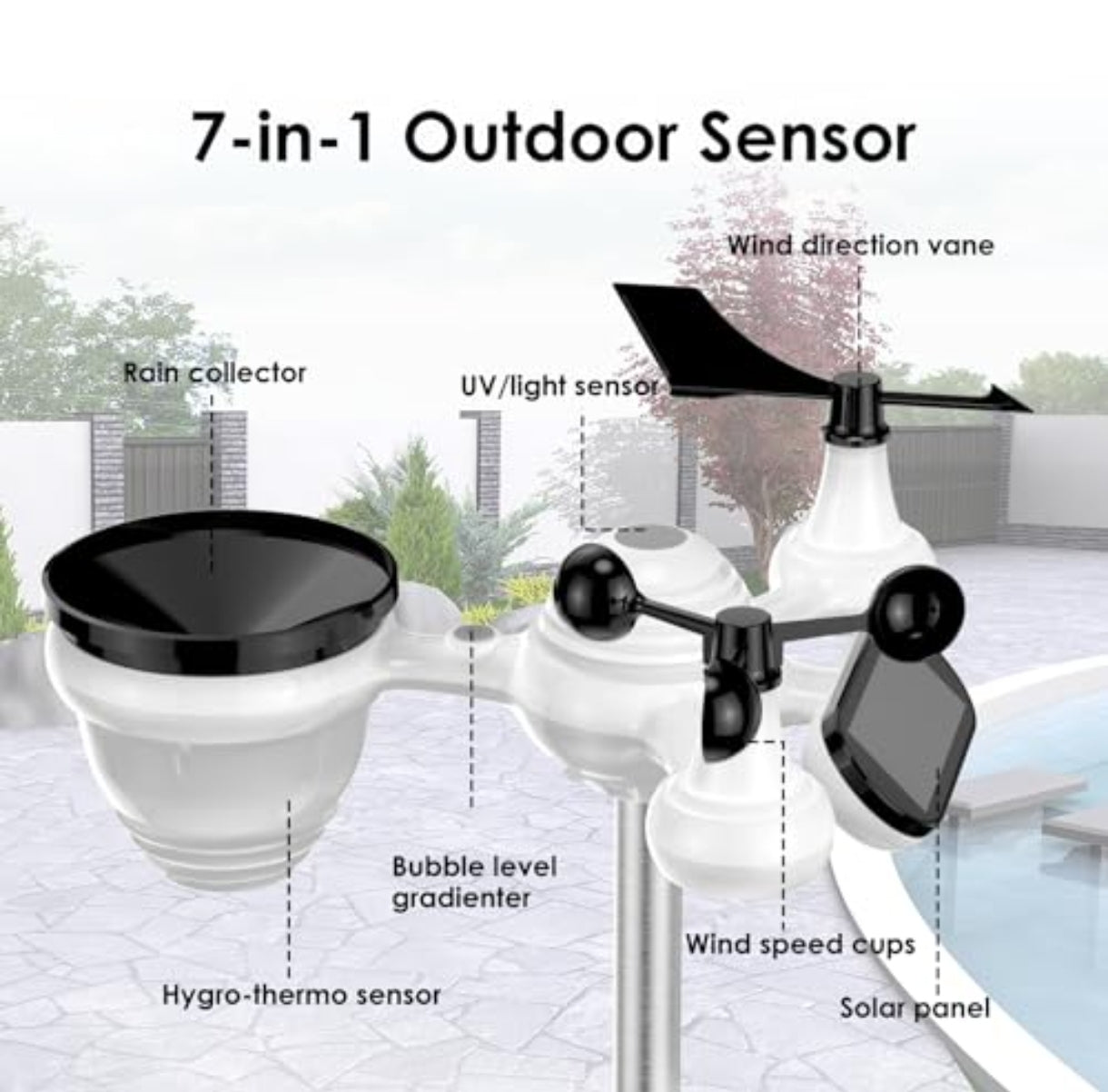 🔹 Napredna 7-v-1 vremenska postaja – meri temperaturo, vlago, hitrost in smer vetra, količino padavin, UV sevanje ter svetlobno jakost
