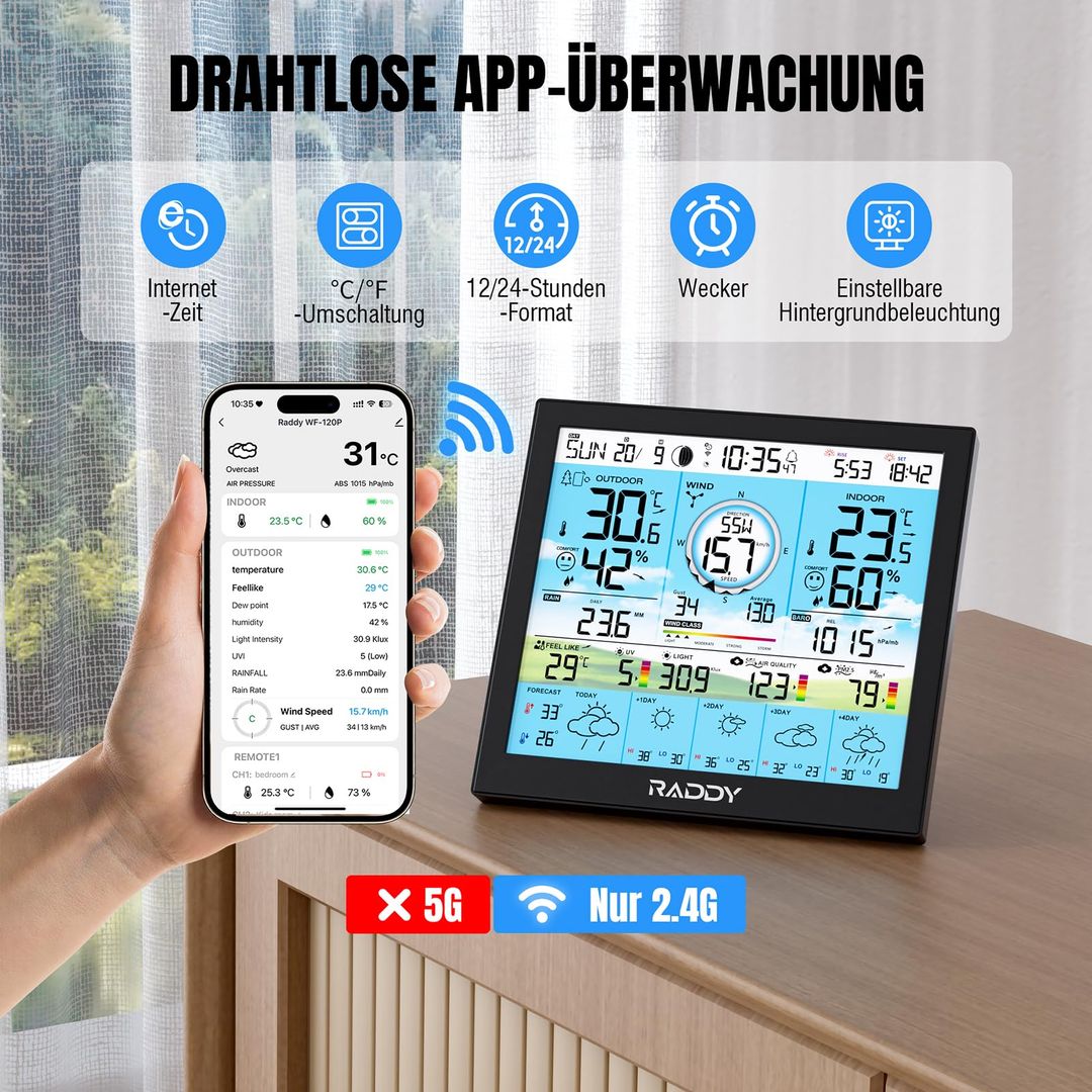 🔹 Prikazane vrednosti vključujejo notranjo/zunanjo temperaturo, vlago, zračni tlak in padavine.
