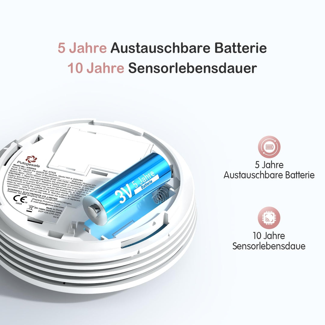 PUTOGESAFE brezžični povezljiv javljalnik dima – 868 MHz, 10-letna življenjska doba