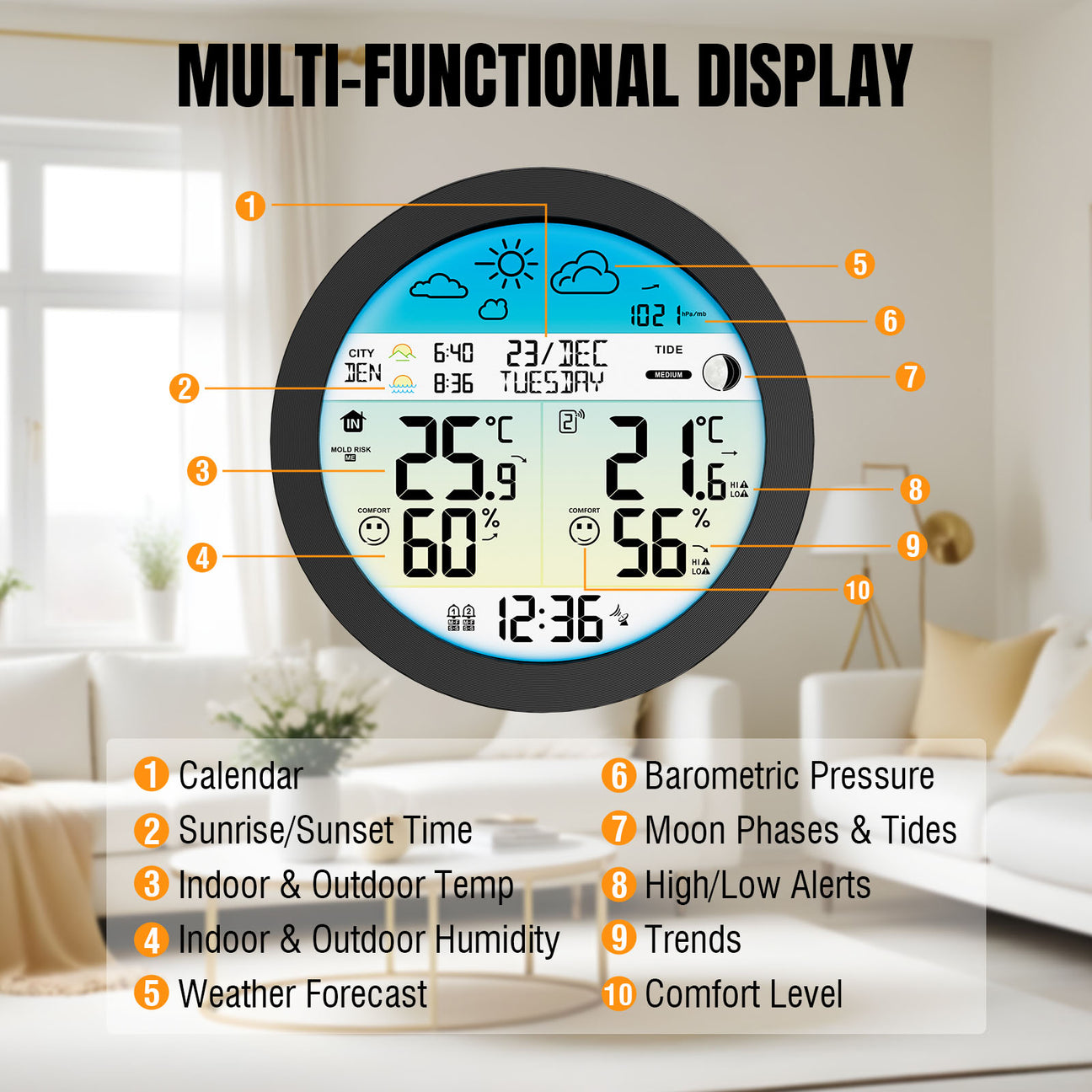 🔹 Velik okrogel 6.6” barvni zaslon z jasno in pregledno prikazano temperaturo, vlago in vremensko napovedjo