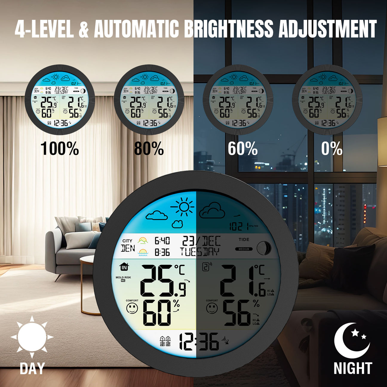 🔹 Samodejna nastavitev svetlosti z 4 stopnjami (100%, 80%, 60%, 0%) glede na svetlobo prostora